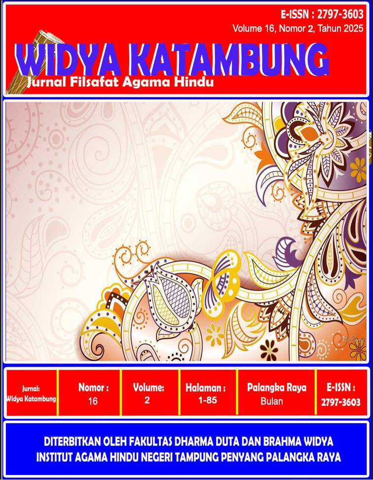 Pada edisi ini Jurnal Widya Katambung Volume 16 Nomor 1 Tahun 2025 telah menerbitkan 6 (enam) artikel yang masing-masing berjudul: Bentuk Seni Dalam Upacara Umat Hindu di Kalimantan Tengah, Tantangan dan Strategi Pelestarian Tradisi Hindu Kaharingan Di Era Modernisasi, The Philosophy Of The Role Of Female Sangiang Craftsmen In The Gender Mainstreaming Of Central Kalimantan, Analysis Of Kresna's Political Attitude As A Role Model In Facing Post-Election Dynamics, Filsafat Arthur Schopenhauer Dalam Perspektif Agama Hindu, dan Bentuk, Fungsi, dan Makna Upacara Manenung di Desa Tumbang Baringei Kecamatan Rungan Kabupaten Gunung Mas
